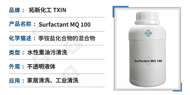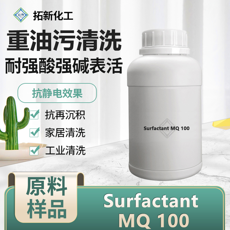 Surfactant MQ 100是一种非离子和阳离子表面活性的特种混合物。具有非常强的脱脂和油污剥离能力,对重油污、重垢具有卓越的清洁能力。同时Surfactant MQ 100对酸、碱耐受性强,特别适用于家居、汽车和各种工业清洗应用。